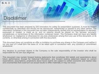 Sai Innovations provides technology solutions and services to empower businesses. This document outlines Sai Innovations' corporate overview, mission, vision, and solutions portfolio. It also provides an agenda for an upcoming presentation covering these topics in more detail. The document contains several disclaimers indicating it is for presentation purposes only and does not constitute an offer or investment advice. It also notes forward-looking statements are based on expectations and actual results may differ.