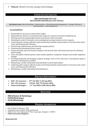 This document contains the resume of Manjunatha M.B. summarizing his professional experience, qualifications, and areas of expertise. It outlines his 7 years of experience in sales and marketing management roles. It details his responsibilities managing teams, clients, distribution networks, and strategic planning. It provides evidence of his success through awards and continuous sales incentives. His objective is seeking a manager or team manager position to apply his strategic thinking, change leadership, and communication skills.
