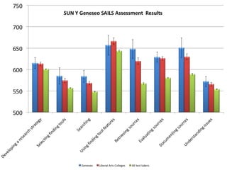 The document discusses the use of a standardized assessment called Project SAILS to evaluate information literacy skills among students at SUNY Geneseo. It highlights the pros, such as time savings and ability to compare results, and cons, including cost and limited access to individual data. Results indicated that library instruction positively impacts student performance, although challenges remain in achieving statistically significant data and the assessment may not be used again in the near future.