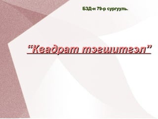 Ерөнхий бүтэц Гүйцэт биш квадрат тэгшитгэл 1 Гүйцэт квадрат тэгшитгэл 2 Дасгал ажил 3 Квадрат тэгшитгэлийн хэрэглээ 4 - 3.