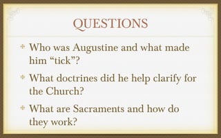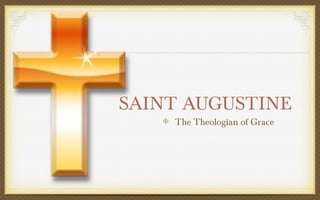 Saint Augustine of Hippo was a prominent theologian and philosopher in the 4th-5th centuries AD who helped shape many Christian doctrines. He is renowned for clarifying the Trinity, predestination, original sin, grace, and other theological concepts. Augustine emphasized that humanity is incapable of achieving salvation through free will alone and requires God's grace. He argued against the Pelagian idea that humans can attain salvation through their own moral efforts without divine aid. Augustine maintained that God's grace is necessary to overcome the effects of original sin and enable humans to have free will and do good. His writings, such as Confessions and City of God, had immense influence on Western Christianity.