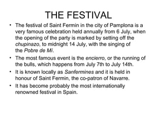 The Saint Fermin festival in Pamplona, Spain is an annual celebration held from July 6-14 that includes religious ceremonies and traditions that have evolved over centuries. Key events include the running of the bulls through the streets, fireworks displays, parades featuring giant figures and masks, and closing the festival with singing at midnight on July 14th. The festival blends medieval traditions like cattle fairs with religious observances of the saint, and gained international fame through Ernest Hemingway's writings.