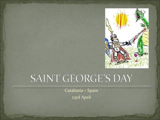 The document discusses St. George's Day, which is celebrated annually on April 23rd in Catalonia, Spain. It notes that St. George is the patron saint of Catalonia according to legend. On this day, men gift women roses and receive books in return, in a tradition started in 1926 to honor author Miguel de Cervantes. Students write poems and stories for a literary contest where winners receive roses. People also eat a special bread resembling the Catalan flag made with sobrassada sausage to mark the occasion.