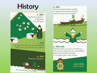 St. Patrick's Day is celebrated on March 17th each year to commemorate St. Patrick, the patron saint of Ireland. It originated as a Christian religious holiday but is now celebrated in other places and by non-Irish people. Traditions include wearing green, pinching those who don't wear green, and associating the shamrock with luck and the Christian Trinity. Events and festivals take place over the five-day celebration.
