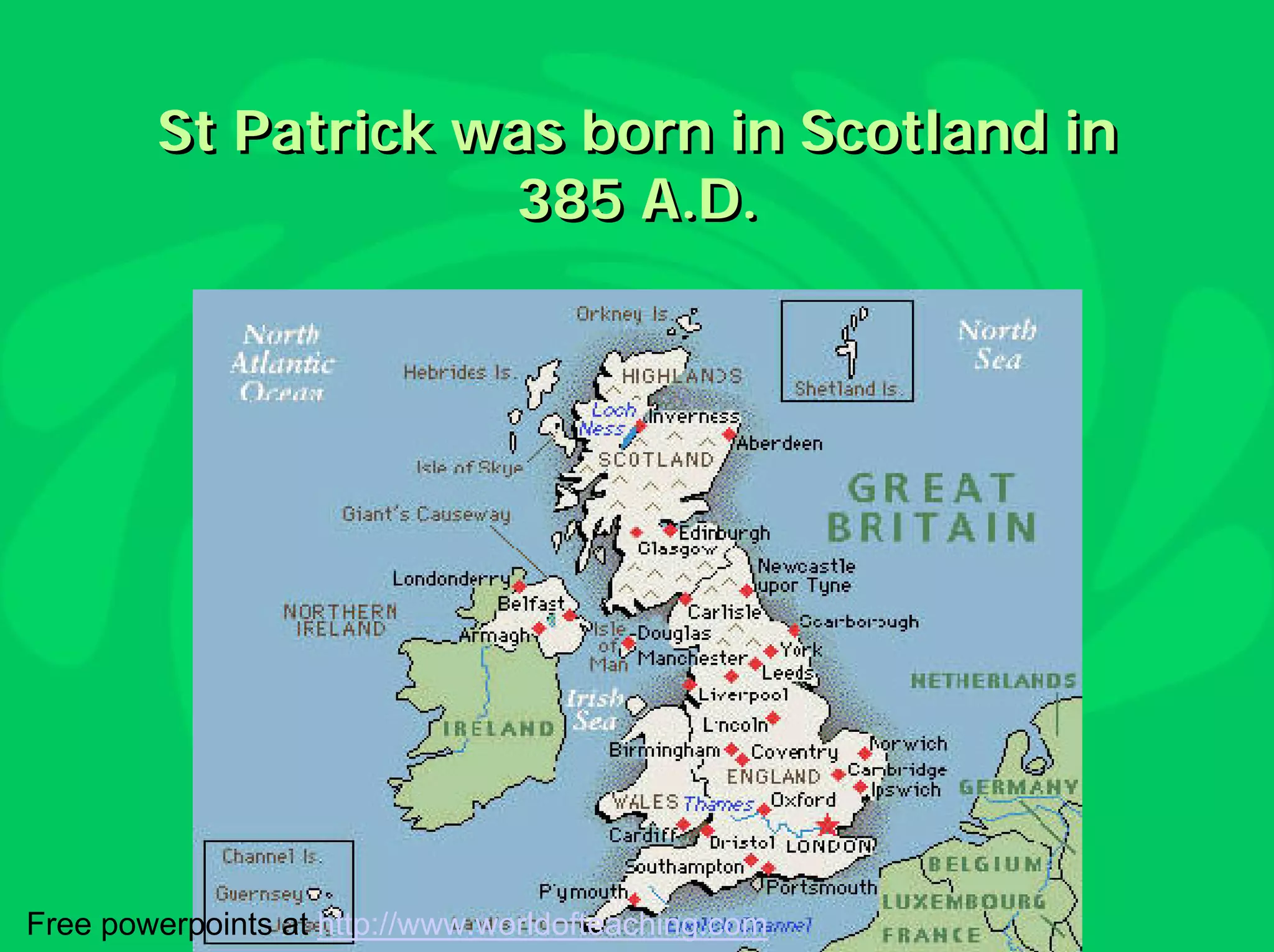 St. Patrick was born in Scotland in 385 A.D., became a priest and went to Ireland to teach the local people about Christianity, where he is credited with driving all the snakes from Ireland by using the shamrock to explain the Holy Trinity; he died on March 17, 461 A.D. and his feast day is now celebrated with parades, dancing, and wearing of green in both Ireland and America.