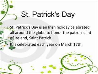 St. Patrick's Day is celebrated on March 17th each year to honor Saint Patrick, the patron saint of Ireland. According to legend, Saint Patrick used a drum to drive all the snakes out of Ireland. Traditional symbols of Saint Patrick's Day include the shamrock, leprechauns, and the color green. The harp is also a symbol of Ireland. Kissing the Blarney Stone is believed to give the gift of eloquence.