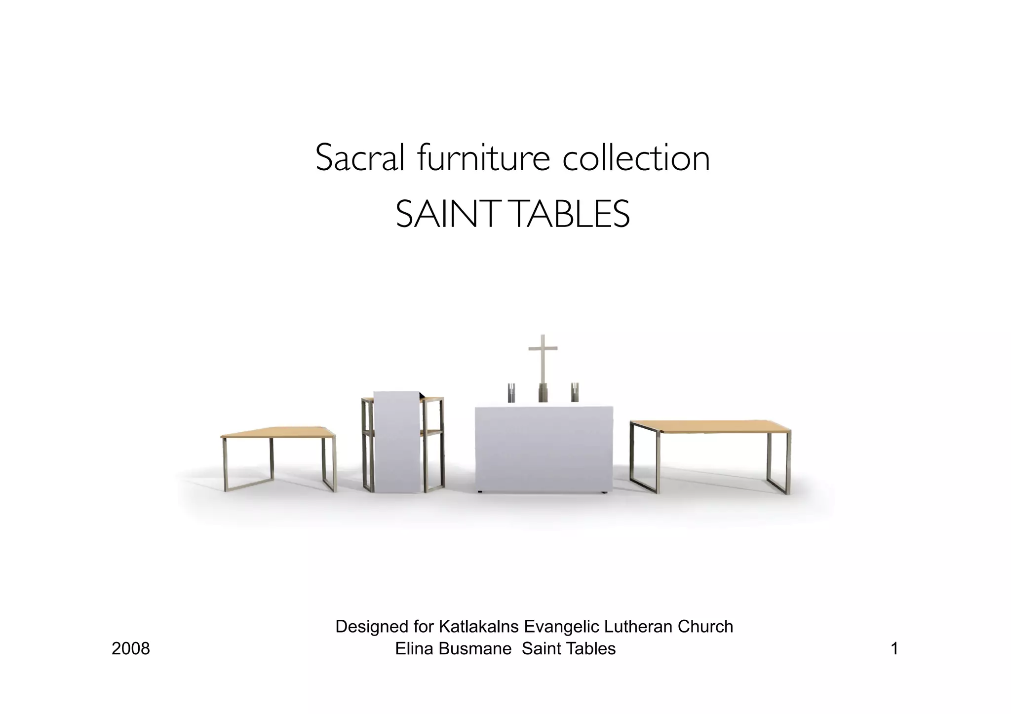 The document describes a furniture collection called "Saint Tables" designed by Elina Busmane for Katlakalns Evangelic Lutheran Church in 2008. The collection includes conference tables, reading tables, and altars that are versatile furniture pieces suitable for use in religious and public spaces and can be arranged variably in space. The collection was designed to meet the needs of the church.