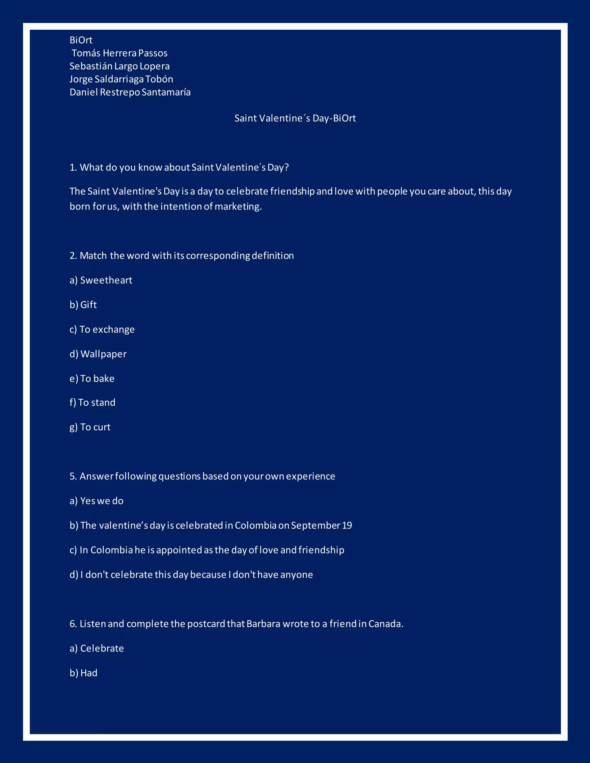 Saint Valentine's Day is celebrated on February 14th and is a day to celebrate love and friendship. In Colombia, Saint Valentine's Day is celebrated on September 19th and is known as the day of love and friendship. The document discusses Saint Valentine's Day traditions like exchanging gifts and discusses how the holiday is celebrated differently in Colombia with more cheerful celebrations and the tradition of giving gifts.