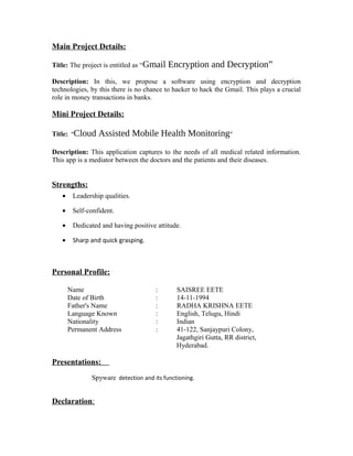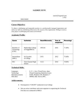 Saisree Eete is seeking a challenging position that utilizes her skills and allows her to contribute effectively to an organization's success. She has a Bachelor of Technology degree in computer science and engineering with 71% marks. Her technical skills include programming languages like C, C++, Java and technologies like cloud computing on Salesforce and operating systems like UNIX, Windows. She has participated in technical events and organized a technical fest. Her main college project was on encrypting and decrypting Gmail to prevent hacking. Her mini project was a mobile health monitoring application. She considers herself a leader with self-confidence, dedication and a positive attitude.