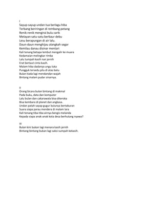 Puisi ini menggambarkan suasana alam yang penuh emosi, mengaitkan keindahan dan kesedihan kehidupan. Ada transisi dari kedamaian di siang hari menuju kesedihan malam yang diwarnai oleh hilangnya keanggunan bulan dan bintang. Terdapat refleksi tentang pergeseran nilai, dari romantisme alam menjadi analisis ilmiah yang menjauhkan kita dari keindahan aslinya.