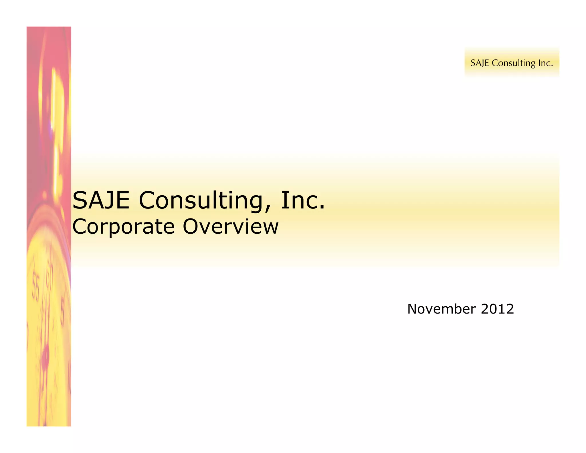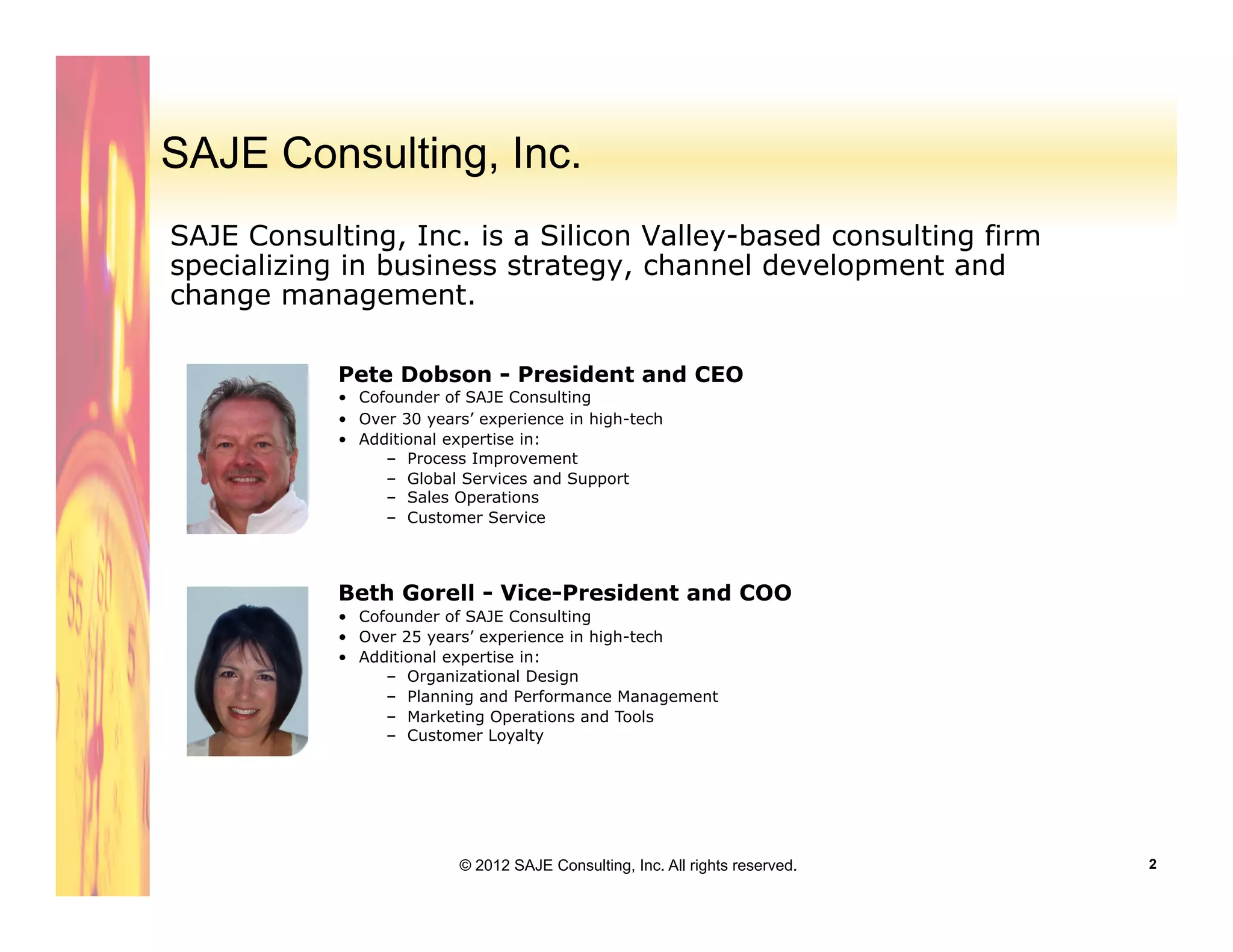 SAJE Consulting is a Silicon Valley consulting firm specializing in business strategy, channel development, and change management. It was co-founded by Pete Dobson and Beth Gorell who have over 50 years of combined experience in high-tech. SAJE provides senior consultants to help clients achieve quantifiable results through hands-on work building organizational alignment and practical implementation plans to achieve strategic transformations. SAJE's services include business strategy, channel development, change management, and benchmarking to ensure clients achieve their vision for success.