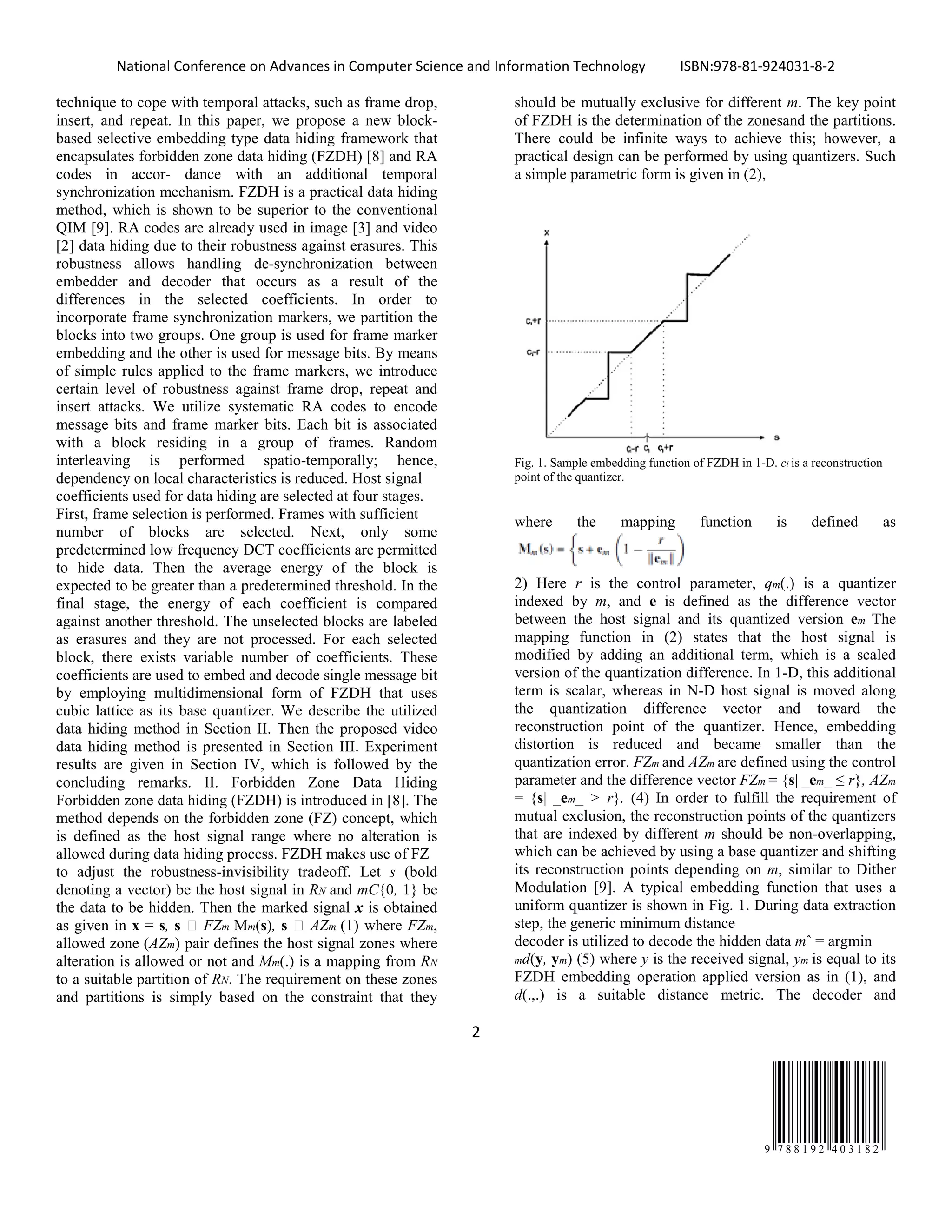This document summarizes a proposed video data hiding method that uses selective embedding and error correction coding to make the data hiding robust against attacks. The method uses forbidden zone data hiding to embed data in selected DCT coefficients of video frames. Adaptive coefficient selection is used to determine the best coefficients for embedding. Repeat accumulate codes are then used to encode the data bits and provide error correction against desynchronization caused by selective embedding or attacks. Frame synchronization markers are also embedded to detect attacks like frame dropping. The proposed method was found to successfully embed data in video and withstand various attacks through simulation tests.