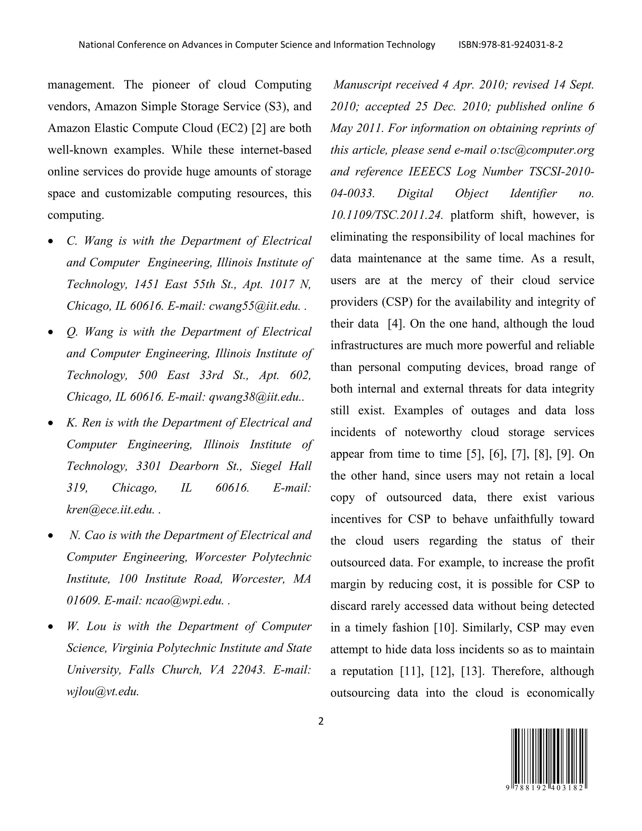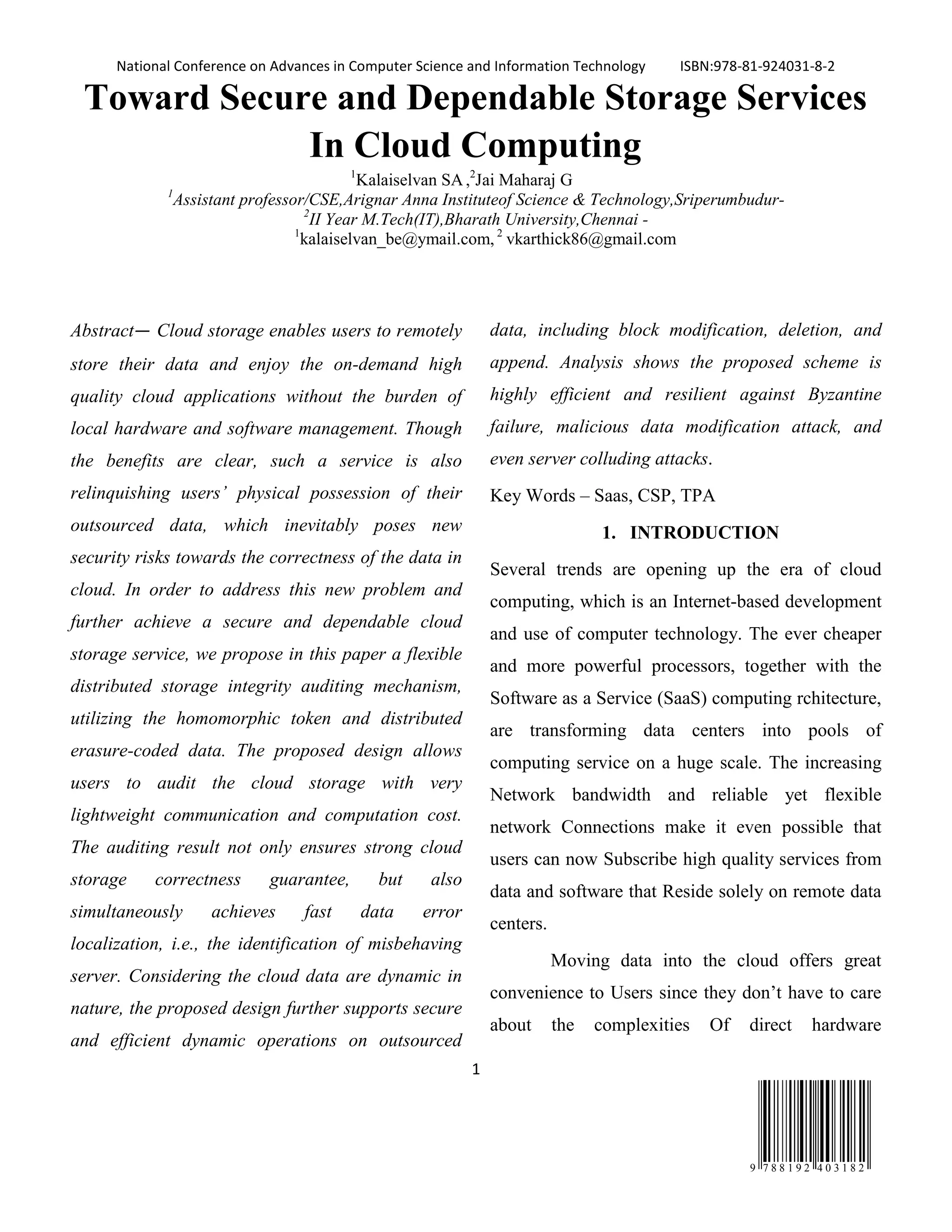 This document proposes a scheme for ensuring data integrity and dependability for cloud storage systems. The scheme utilizes erasure coding to distribute data across multiple servers and generate verification tokens to enable lightweight auditing. It allows users to efficiently audit that their data is intact and to identify any misbehaving servers. The scheme also supports secure dynamic operations like updates, deletes and appends while maintaining the same level of integrity assurance. Analysis shows the scheme is efficient and resilient to various security threats from malicious servers.