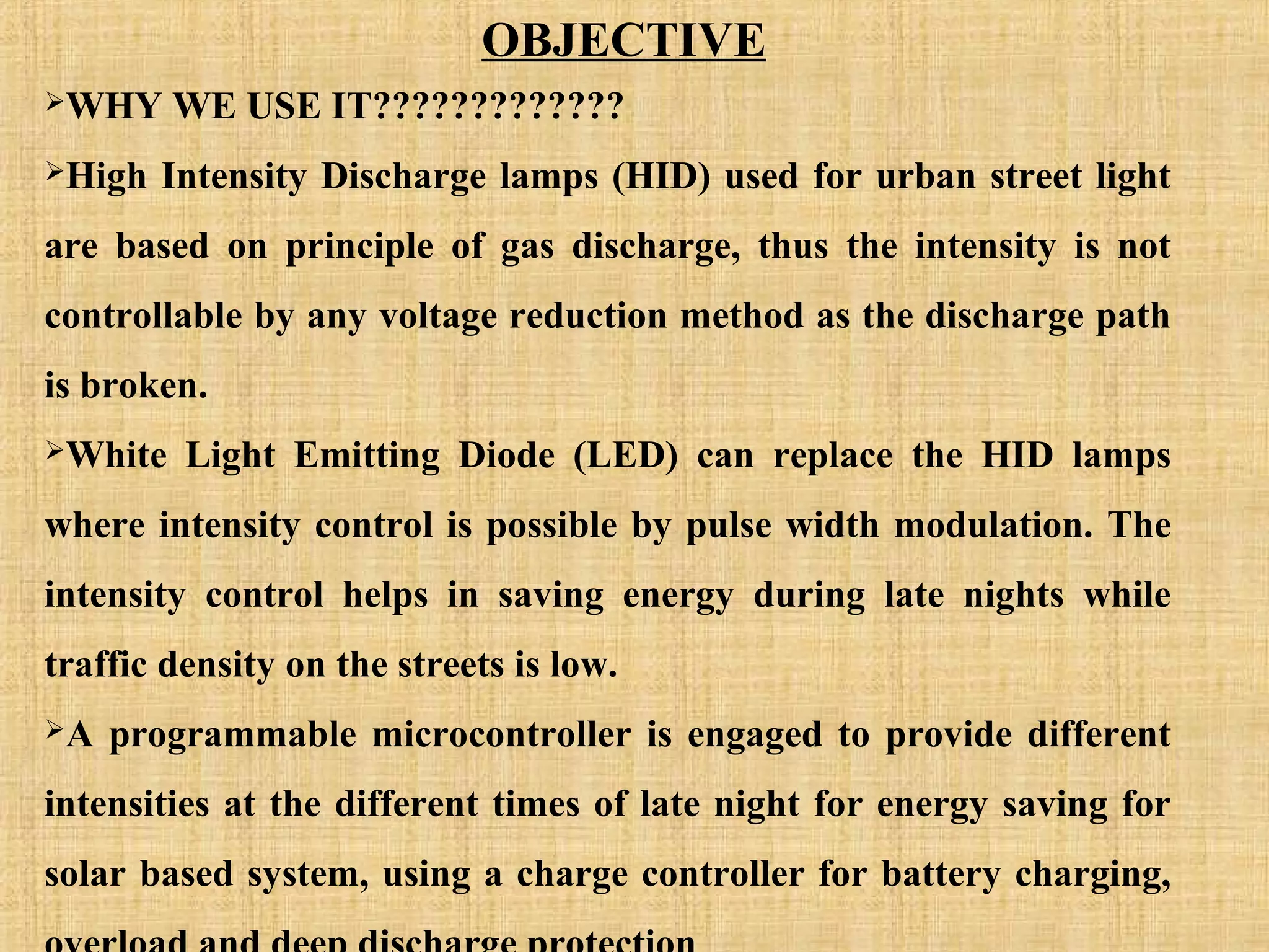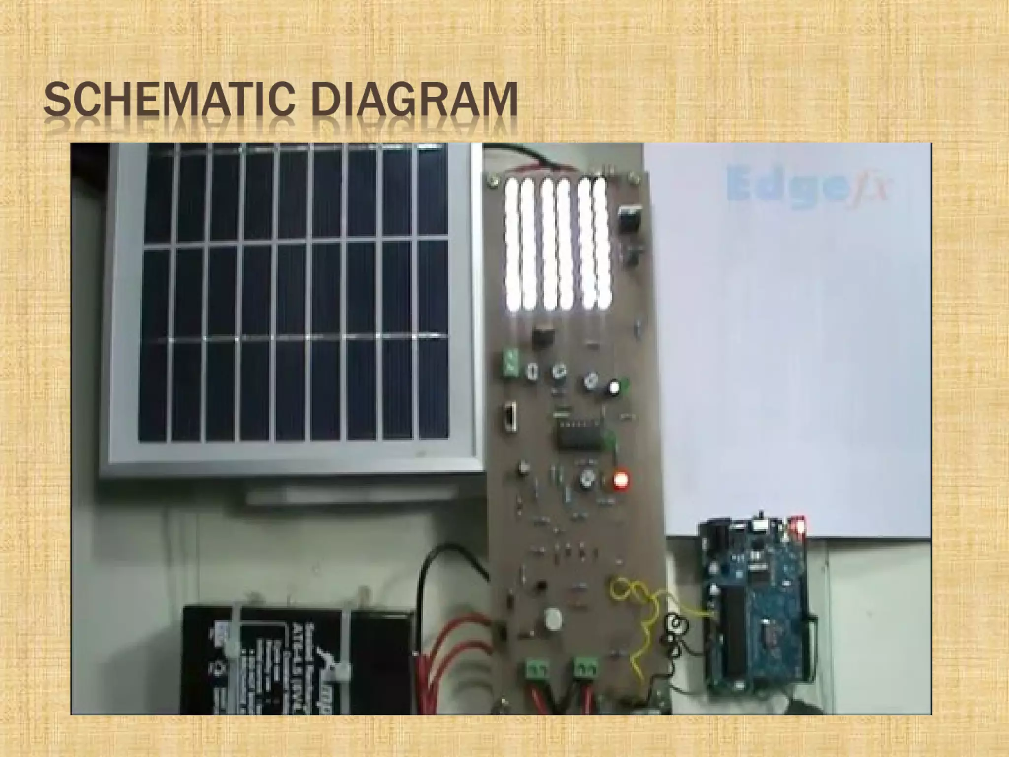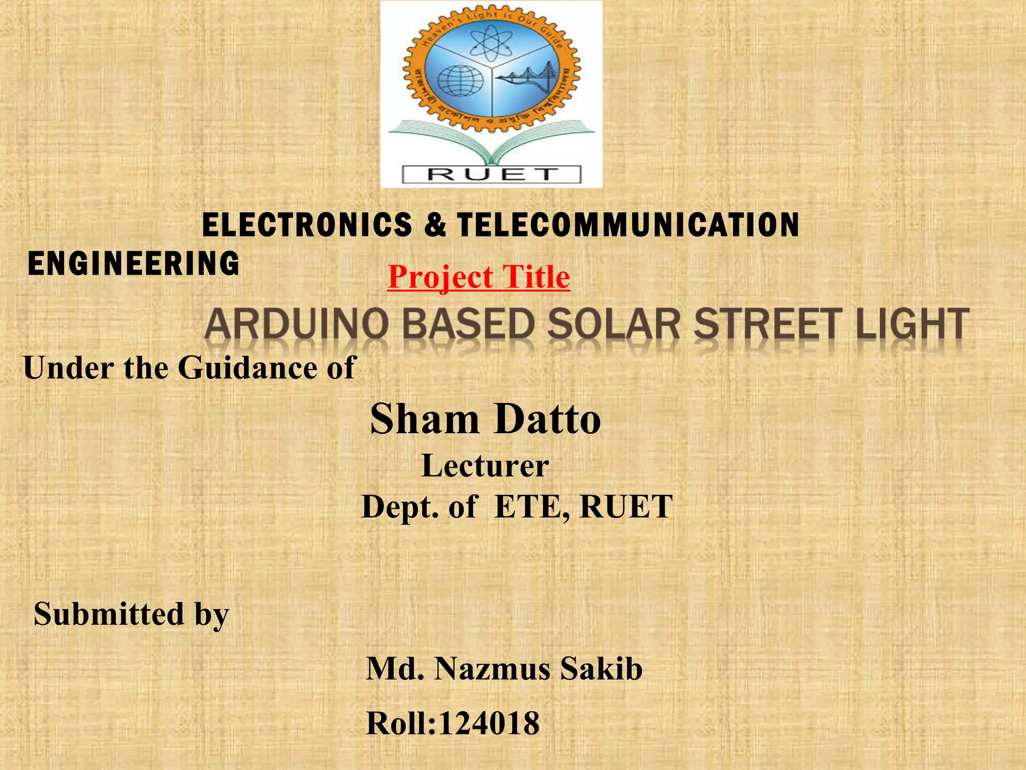 This document describes a student project to develop a solar-powered LED street lighting system with adjustable intensity control. The system uses a microcontroller to provide different light intensities at night based on traffic levels to save energy. Key hardware components include solar panels, batteries, LED lights, a MOSFET transistor for intensity control via pulse-width modulation, and an Arduino microcontroller. The project aims to provide energy-efficient street lighting while allowing intensity adjustment based on time of night and traffic conditions.