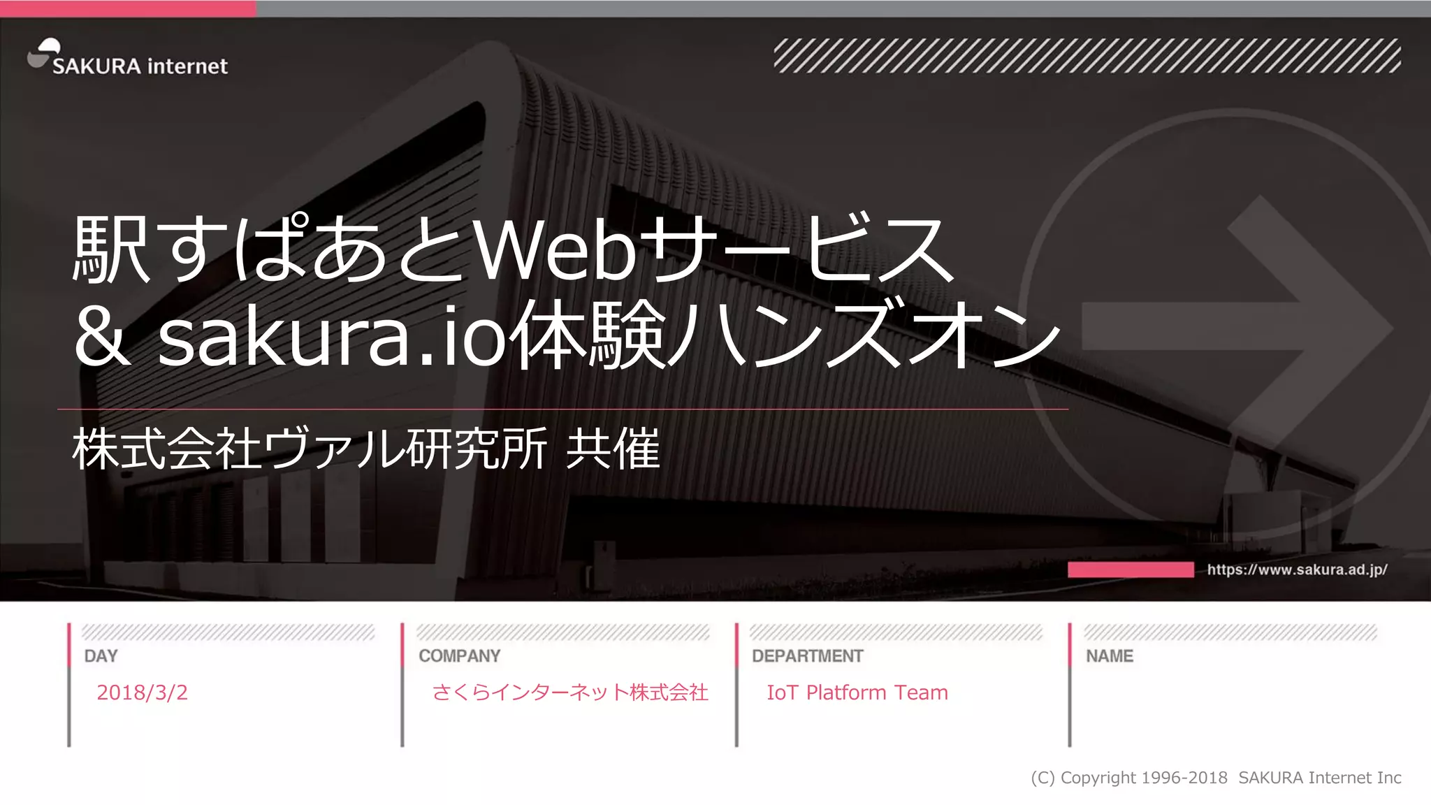 各地で開催されているさくらインターネットが提供するIoTプラットフォーム「sakura.io」とヴァル研究所が提供する「駅すぱあとWebサービス」のコラボハンズオンでの資料となります。