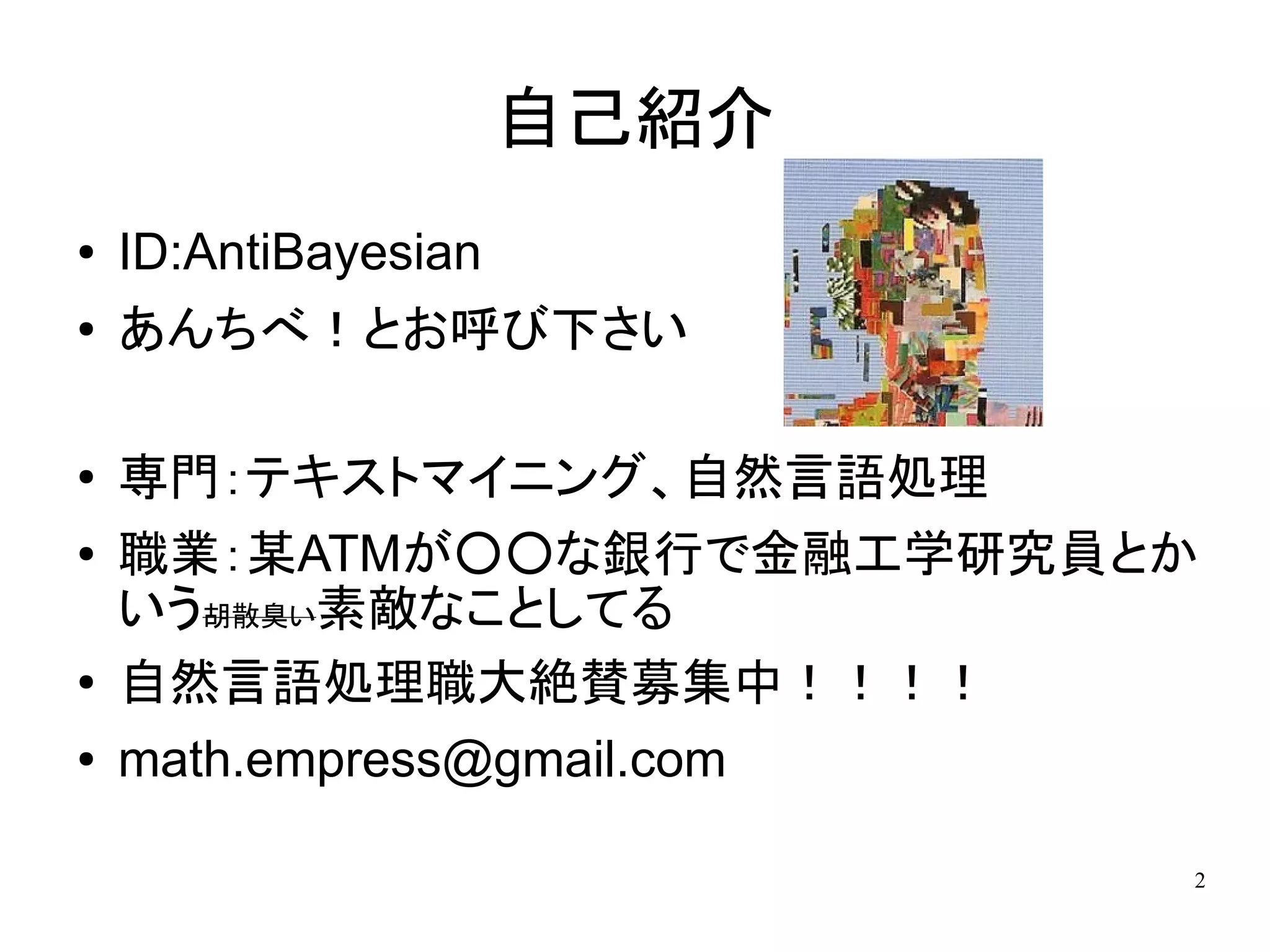 ID:AntiBayesian ● あんちべ!とお呼び下さい ● 専門:テキストマイニング、自然言語処理 ● 職業:某ATMが○○な銀行で金融工学研究員とか いう胡散臭い素敵なことしてる ● 自然言語処理職大絶賛募集中!!!! ● math.empress@gmail.com 2
