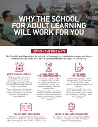 The School for Adult Learning at the University of Indianapolis offers degree programs designed for working adults. The programs allow students to earn a bachelor's degree by taking one class at a time in accelerated five-week sessions that meet on campus just one night a week, fitting into busy schedules. The School for Adult Learning helps students transfer credits from prior experience and coursework and provides support services outside of normal hours. Their accelerated bachelor's degree programs can be completed with only 40-45 classes over 120 credits.