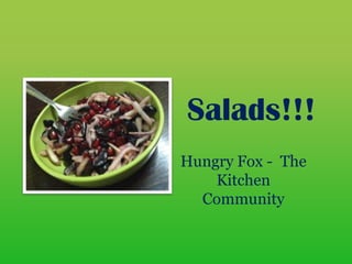 This document discusses salads as a versatile dish made from a mix of fresh ingredients, highlighting their roles as appetizers, main courses, or accompaniments. It details the types of salads—plain/simple and compound/composite—along with essential components like greens, main ingredients, and dressings. The document also introduces modern interpretations of salads, incorporating innovative ingredients and combinations.