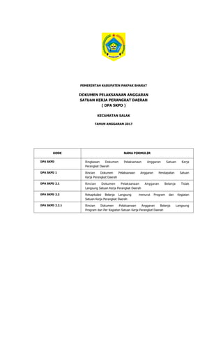 Dokumen ini merinci pelaksanaan anggaran satuan kerja perangkat daerah (SKPD) Kecamatan Salak untuk tahun anggaran 2017 oleh Pemerintah Kabupaten Pakpak Bharat. Total belanja mencapai Rp2.655.514.233, dengan rincian belanja tidak langsung sebesar Rp1.988.579.433 dan belanja langsung Rp666.934.800. Anggaran ini termasuk dalam urusan pemerintahan dan fungsi penunjang administrasi pemerintahan.