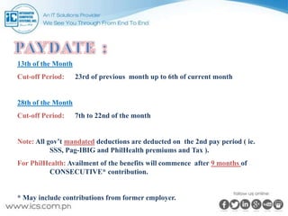 The document outlines pay period dates and cut-off periods for employees. It states that paydays are the 13th and 28th of each month, with the cut-off periods being the 23rd to 6th and the 7th to 22nd respectively. It also notes that government deductions occur on the second pay period and that PhilHealth benefits require 9 months of consecutive contributions which may include time with a former employer. Pay is credited on paydates or the following business day if the paydate falls on a weekend or holiday.