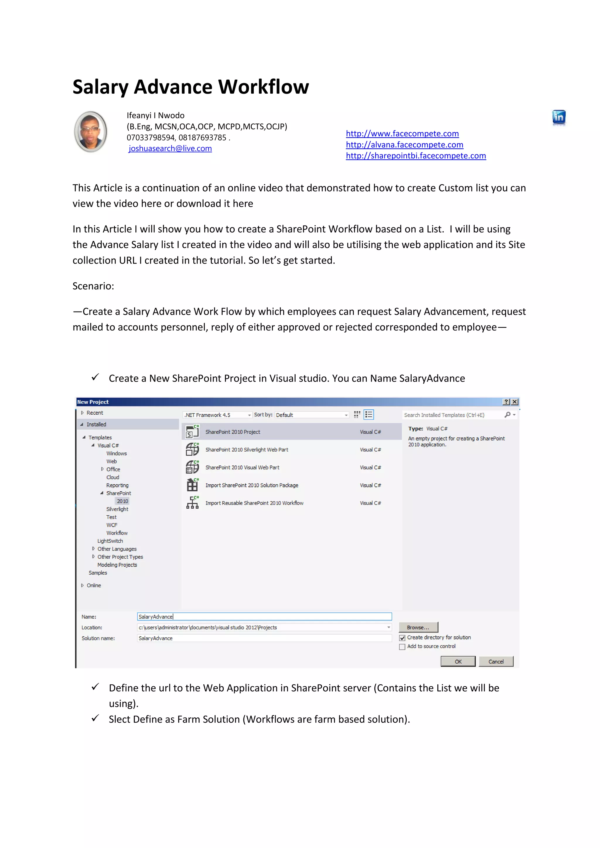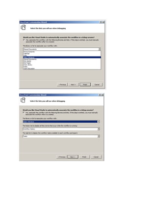 This document describes the steps to create a salary advance workflow in SharePoint using Visual Studio. The workflow allows employees to request a salary advance, which is then sent to the accounts department for approval or rejection. Key steps include: