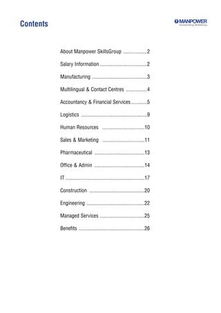 The document provides salary information for various roles in different industries in Ireland in 2003. For each role, it lists the lower, average, and higher salary ranges seen for individuals in that role in euros per year. Roles covered include manufacturing, customer service, accountancy and financial services, logistics, human resources, sales and marketing, pharmaceuticals, IT, construction, and engineering. The salary ranges give an indication of typical salaries for each role at that time.