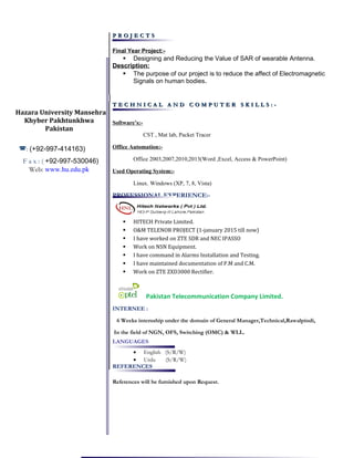 Saleemullah is seeking a position in BS Telecommunications. He has a BS in Telecommunications from Hazara University with first division honors. He has over a year of experience working in O&M for Telenor Pakistan on ZTE and NEC equipment. He is proficient in technical skills like CST, Matlab, and Packet Tracer as well as office software.