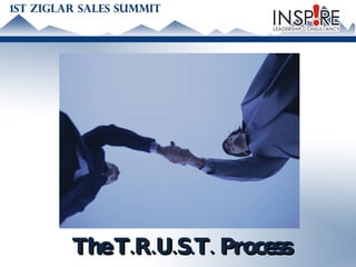 The document outlines the T.R.U.S.T. sales process in 5 steps: 1) Think - establish call objectives, 2) Relate - build trust and rapport, 3) Uncover Needs - identify customer needs, 4) Sell the Solution - present recommendations, 5) Take Action - manage objections and close the sale. It emphasizes establishing rapport, understanding customer needs through questioning, presenting benefits not features, and overcoming objections to make the sale.