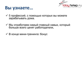 Документ описывает пять профессий для удаленной работы, включая обучение и сертификацию в новых интернет-профессиях, таких как специалист по трафику и администратор социальных сетей. Он также подчеркивает важность навыка продаж и предлагает тренинги по его освоению, включая практические задания и поддержку. В конце документа содержится информация о возможностях трудоустройства и дополнительных материалах для обучения.