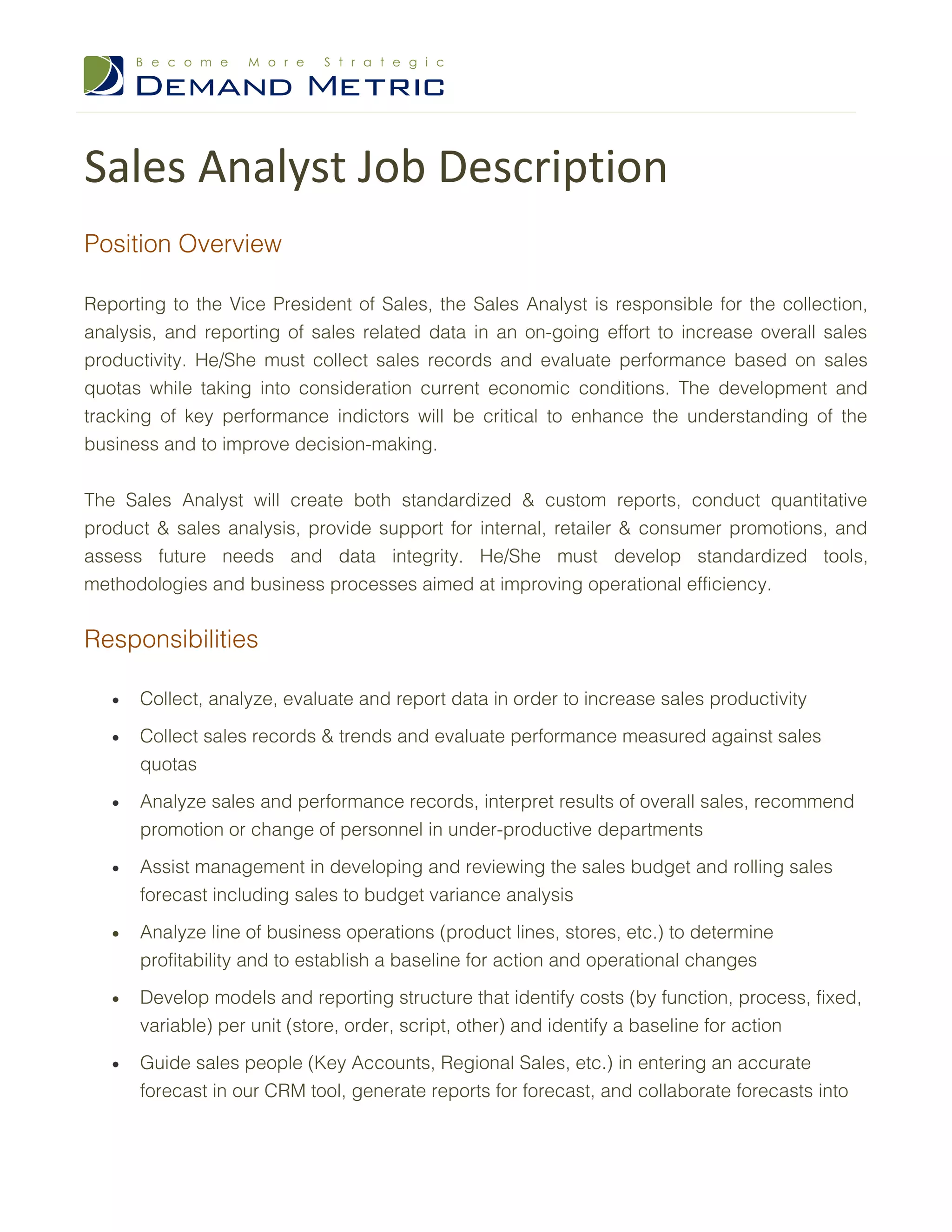 The Sales Analyst is responsible for collecting, analyzing, and reporting sales data to increase sales productivity. They must collect sales records, evaluate performance against quotas, and track key performance indicators. The Sales Analyst will create both standardized and custom reports to conduct quantitative analysis and provide support for promotions. They are also responsible for developing tools and processes to improve operational efficiency.