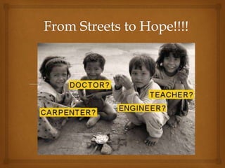 The document discusses the issue of street children in Pakistan, highlighting causes such as urban population growth and poverty, with an estimated 1.2 to 1.5 million affected. A university campaign aims to provide education and support for these children, encouraging community involvement and donations to secure their well-being and development. The campaign seeks to use various marketing strategies to raise awareness and funds, projecting a budget of approximately Rs. 80,000 to launch their initiatives.