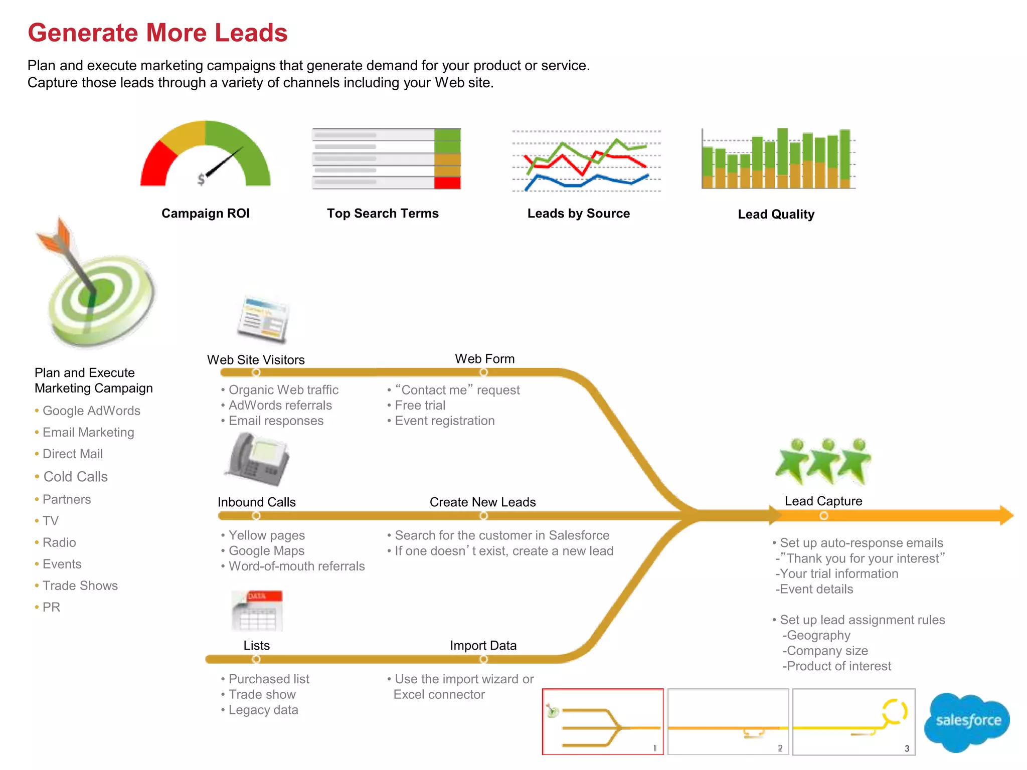 Plan and execute marketing campaigns to generate leads through various channels like the website, email marketing, and events. Capture leads and qualify them by setting up processes to classify leads and convert qualified ones to contacts and opportunities. Provide customer support by logging cases from different channels and resolving them through a streamlined process. Offer 24/7 self-service support through an online customer portal where customers can find solutions, log cases, and engage with the community.