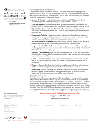 The Sales Cloud is a comprehensive sales application that enhances productivity and collaboration for over 55,400 Salesforce.com customers by providing essential tools to manage relationships with stakeholders, track sales performance, and streamline processes. It enables sales teams to work efficiently in a cloud environment, leading to substantial improvements in sales win rates, productivity, and revenue. With features like integrated email, real-time analytics, and access to a content library, Sales Cloud equips sales representatives to optimize their efforts and close more deals effectively.