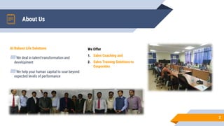 Reboot Life Solutions specializes in sales coaching and training to enhance the performance of sales teams in organizations. The process includes identifying objectives, on-field collaboration, leadership coaching, and post-training evaluation to ensure effective sales interventions. Founders Ajaya Panda and Akash Dutta bring extensive experience in people development and have worked with notable clients across various industries.