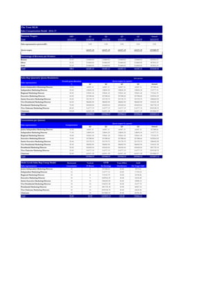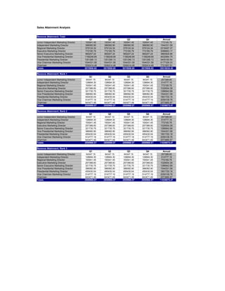 The document outlines the sales compensation model and revenue targets for a multi-level marketing company. It provides quarterly and annual revenue quotas for different sales representative roles, ranging from Junior Independent Marketing Director to Chairman. It also shows how commissions are calculated based on roles and percentage of revenue quotas achieved.