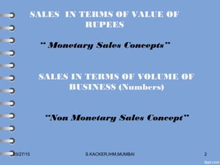 The document discusses monetary and non-monetary concepts of sales in the food and beverage industry. Monetary sales concepts refer to sales measured in rupee value and include total sales volume, rupee sales by category, unit price, and average rupee sales. Non-monetary concepts refer to sales measured by volume and include quantity of items sold, average number of covers, seat turnover, and sales mix.