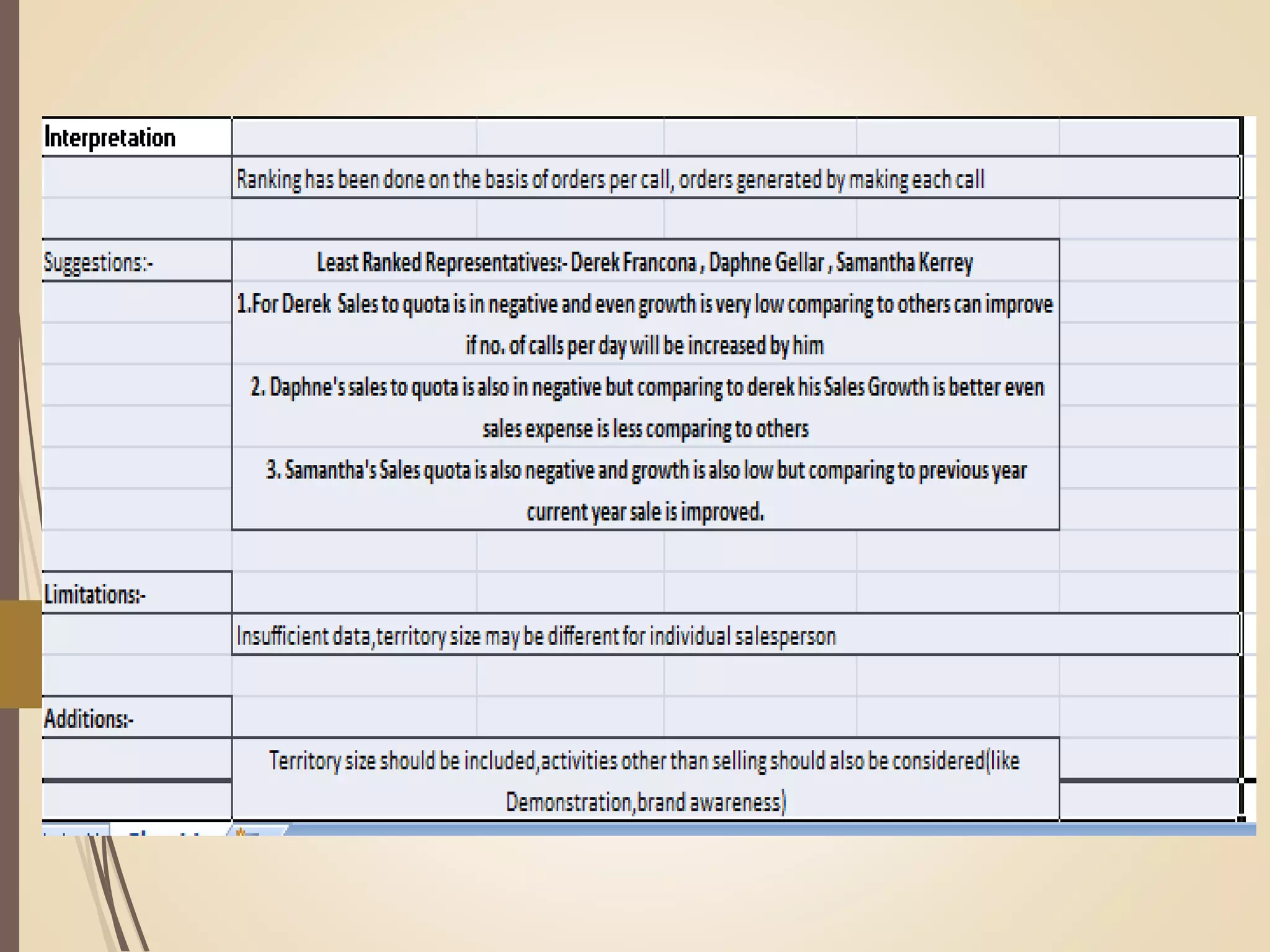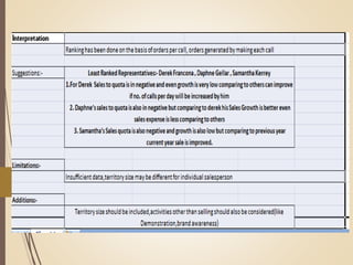 This document summarizes a sales and distribution management presentation submitted by three students. It discusses using FAB analysis to analyze the features, advantages, and benefits of a dining table product. It also includes two case studies, one analyzing the performance of different sales representatives and suggesting ways for an underperforming rep to improve. The other case analyzes performance ratios for different salespeople at a restaurant appliance company. Finally, it discusses three factors to consider when selecting sales territories for pharmaceutical companies Lupin, Glenmark and Pfizer.