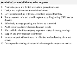 The document details a sales engineer job description, outlining key duties, qualifications, and essential traits required for the role. It includes information on job formatting, necessary skills, education, and working conditions, as well as the KSA (Knowledge, Skills, Abilities) model for competency evaluation. Additionally, it provides resources and templates for those pursuing a sales engineer career across various industries.