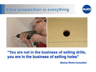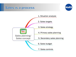 The document provides guidance on various sales and business development skills and strategies. It discusses prospecting, understanding customer pain points, gaining commitment, developing personal and job skills like product knowledge and sales experience. It also covers increasing account size and importance, different sales channels like direct and indirect sales. The document emphasizes the importance of understanding stakeholders, developing a unique value proposition, validating the product/market fit, and targeting the right customer segment.