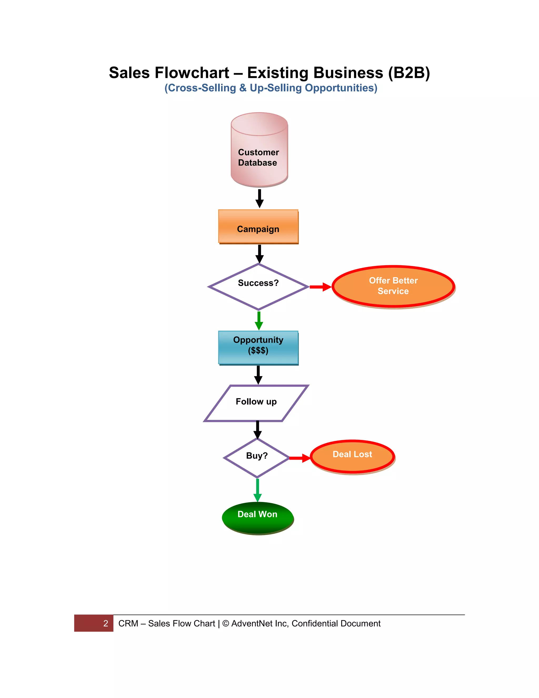 The document outlines sales flowcharts for new and existing business in both B2B and B2C contexts. It shows the process from lead generation and assignment to follow up, qualifying leads, converting leads to prospects, creating opportunities, following up on opportunities, and whether deals are won or lost. It also includes using customer databases to generate sales for existing customers through campaigns and cross-selling or up-selling. Definitions of B2B and B2C are provided along with contact information.