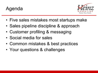 The document provides an overview of common mistakes startups make in sales and recommendations for an effective sales process. It discusses hiring sales leadership too early, spending on marketing before defining the sales process, selling beyond early adopters, and building the sales team too quickly. The document also outlines prospecting and sales funnel strategies like social media engagement, customer profiling, and developing targeted messaging. It provides templates for calculating sales goals and pipelines. Finally, it discusses alternatives to cold calling, improving messaging to address customer pain points, and managing prospects that lose interest.