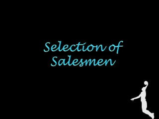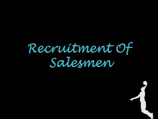 This document provides information on sales force management and sales training. It discusses the meaning and definition of recruitment, characteristics of recruitment, and the process of recruiting salesmen including determining the nature, number, and sources of salesmen. It also covers the meaning of selection, its importance, who selects salesmen, principles and methods used in selection, and selection tests. Finally, it discusses the meaning and objectives of sales training, its importance, types of training, contents of a good training scheme, and planning a sales training program in terms of its aim, content, method of execution, and evaluation.