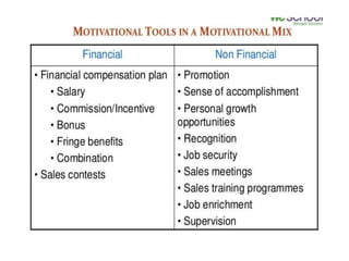 This document discusses the key activities involved in managing a sales force, including job analysis, job descriptions, recruitment, selection, training, motivation, compensation, and performance evaluation. It provides details on each process and notes that sales force management involves determining optimal sales force size and selling styles. Additionally, it states that sales force management activities are interconnected and decisions in one area can impact other areas.