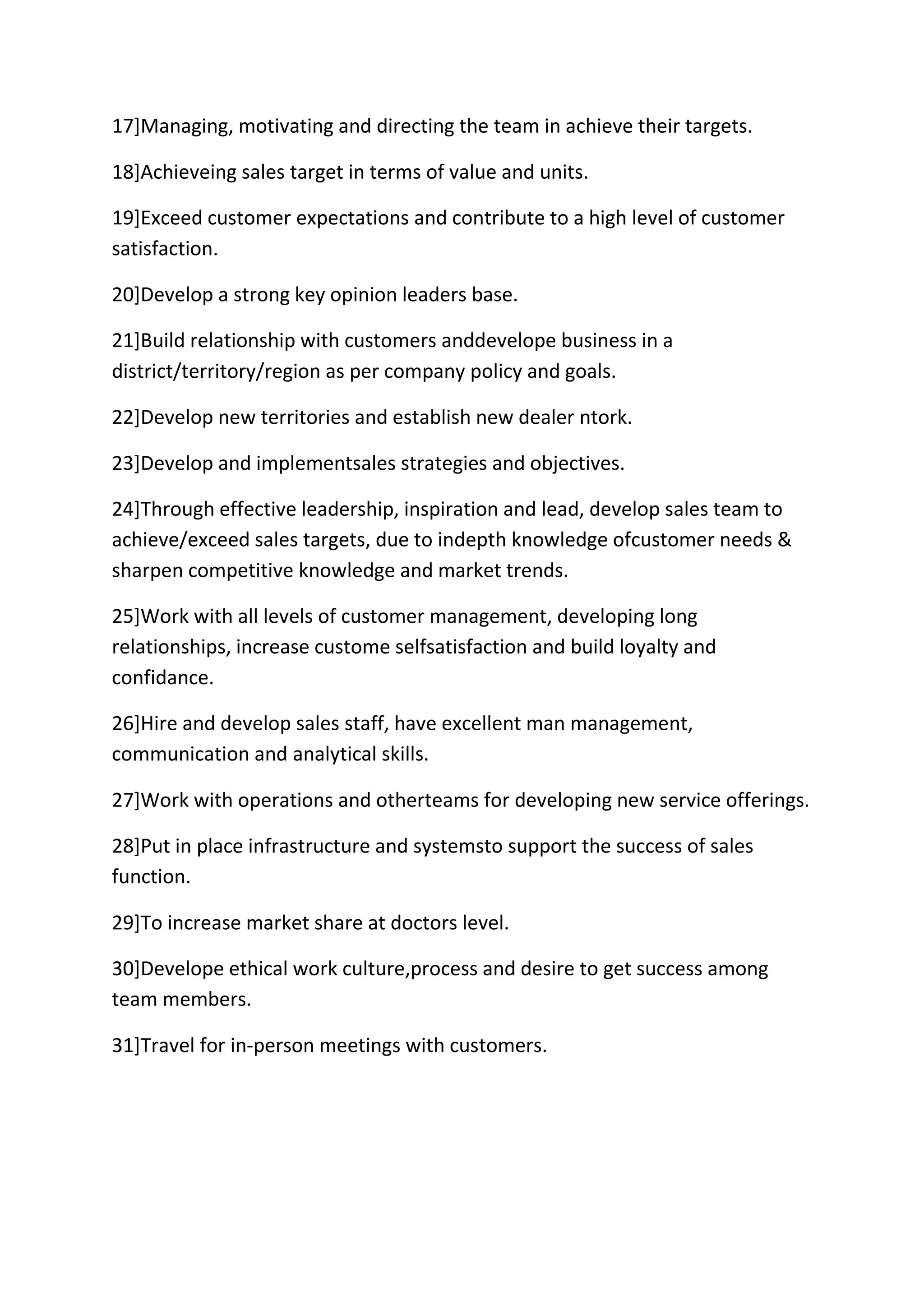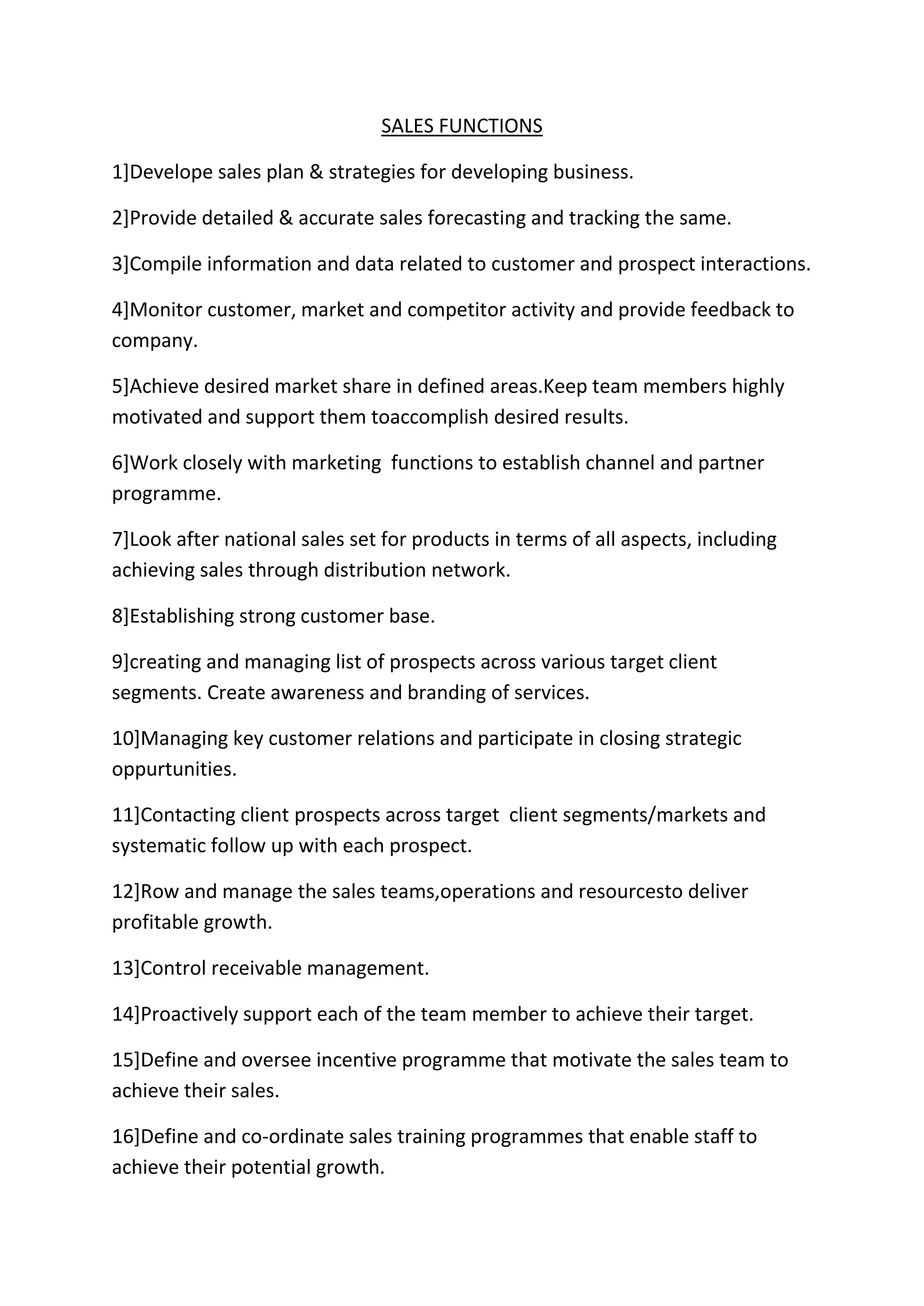 The document outlines the key responsibilities of sales functions which include developing sales plans and strategies, providing accurate sales forecasting and tracking, compiling customer data, monitoring the market and competitors, achieving sales targets, managing customer relationships, developing new territories, hiring and motivating a sales team, and putting systems in place to support the sales process.