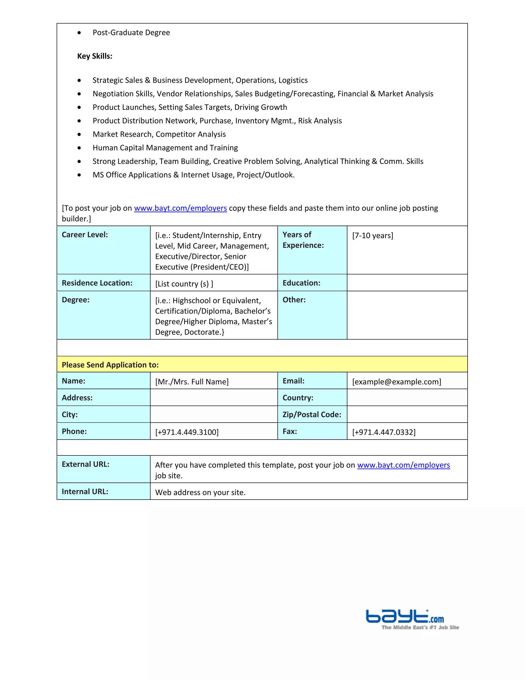 The document is a job posting for a Sales Manager position. It includes responsibilities like designing sales plans, directing forecasting activities, administering showrooms, and overseeing product inventory. Key qualifications listed are a Bachelor's degree, 7-10 years of sales management experience, skills in strategic sales, operations, negotiation, and leadership. The position is full-time and located in Abu Dhabi with a monthly salary range of $9,000-$12,000.