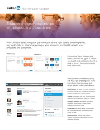 The LinkedIn Sales Navigator provides customized recommendations and insights to help sales professionals focus on the right prospects, stay up-to-date on accounts and contacts, and build relationships. It combines LinkedIn network data, relevant news, and user preferences and accounts to produce alerts on lead changes, company updates, people mentions in news, and new hires at accounts. The tool also offers deep dives into company pages, recommendations of new leads tailored to the user, ways to get introduced to prospects through colleagues' connections, and advanced search and profile access to find and qualify prospects.
