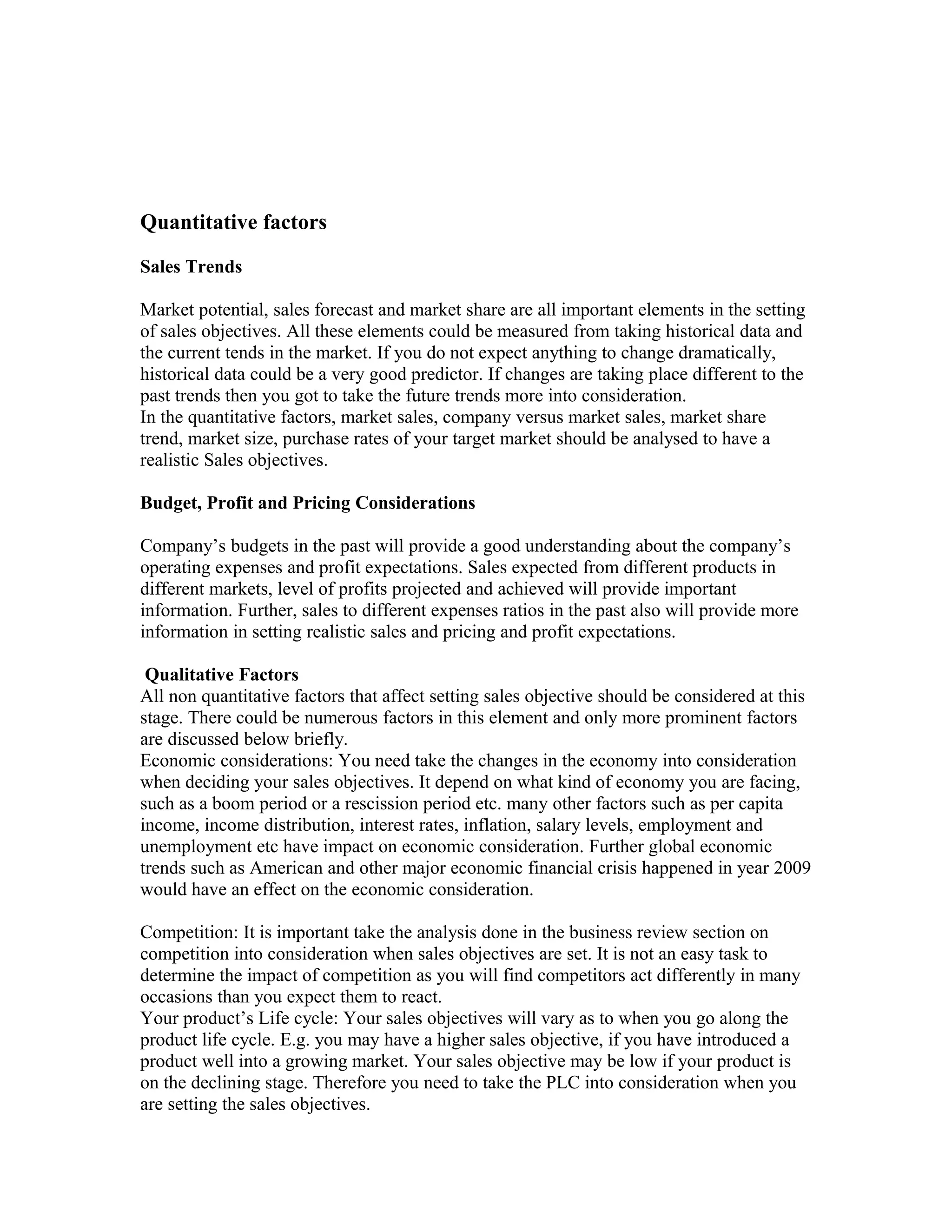 Sales objectives are targets for how much of a product or service a company aims to sell. They should be specific, measurable, achievable, realistic, and time-bound (SMART). Multiple quantitative and qualitative factors should be considered when setting sales objectives. Quantitative factors include historical sales trends, market potential, and budget/profit projections. Qualitative factors include economic conditions, competition, and the company's mission. Sales objectives can be set using outside macro analysis of total market sales and projected market share, inside micro analysis of past company sales trends, or expense-plus analysis of required sales to cover costs and profits. The objectives should then be reconciled and adjusted based on qualitative factors. Sales forecasts help implement the objectives and can utilize