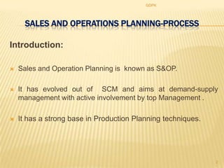 The document describes the sales and operations planning (S&OP) process. It consists of 5 phases: 1) data collection, 2) demand planning, 3) supply planning, 4) pre-meeting, and 5) executive meeting. The process aims to integrate customer marketing plans with supply chain management to provide strategic direction. It allows management to balance demand and supply on an ongoing basis and make timely decisions to impact profitability.