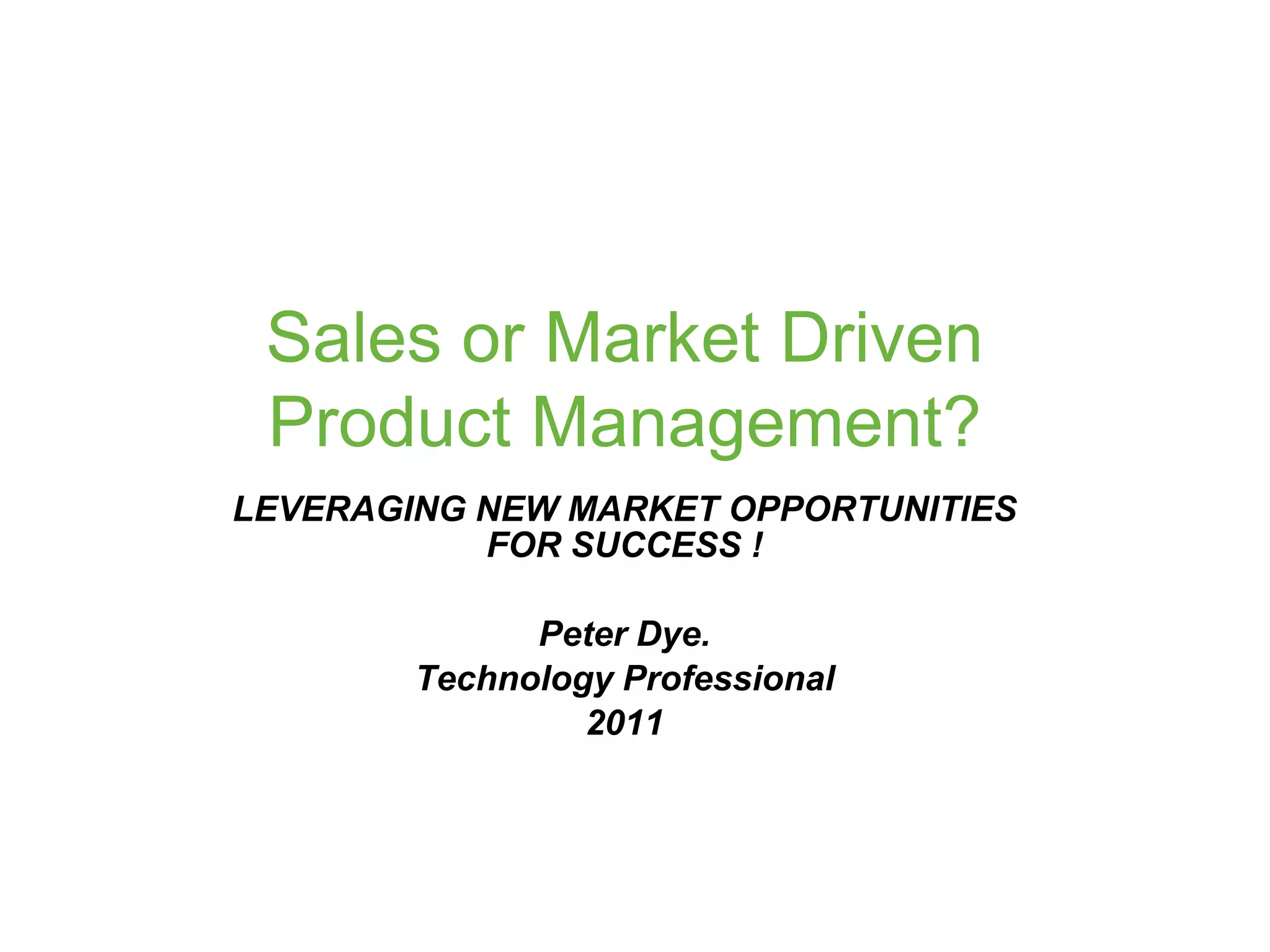 This document discusses the advantages and disadvantages of sales-driven versus market-driven product management strategies. It notes that while a sales-driven approach can work well for emerging companies, a market-driven strategy is better for long-term success by developing sustainable product lines that build market leadership. The document provides details on the roles and responsibilities of a product manager and how they must communicate with various stakeholders. It ultimately concludes that an emerging product is better suited to short-term, sales-driven tactics for increased revenue, while a market-driven strategy allows for planned innovations to create new market opportunities.