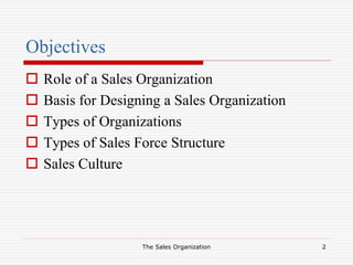 The document discusses the key aspects of designing a sales organization, including the role of the sales organization, basis for the design, types of organizational structures, sales force structures, and sales culture. Specifically, it outlines different types of organizational structures like formal vs informal and horizontal vs vertical. It also describes different sales force structures such as product-based, geographic-based, and customer-based. Finally, it discusses the importance of developing an effective sales culture.
